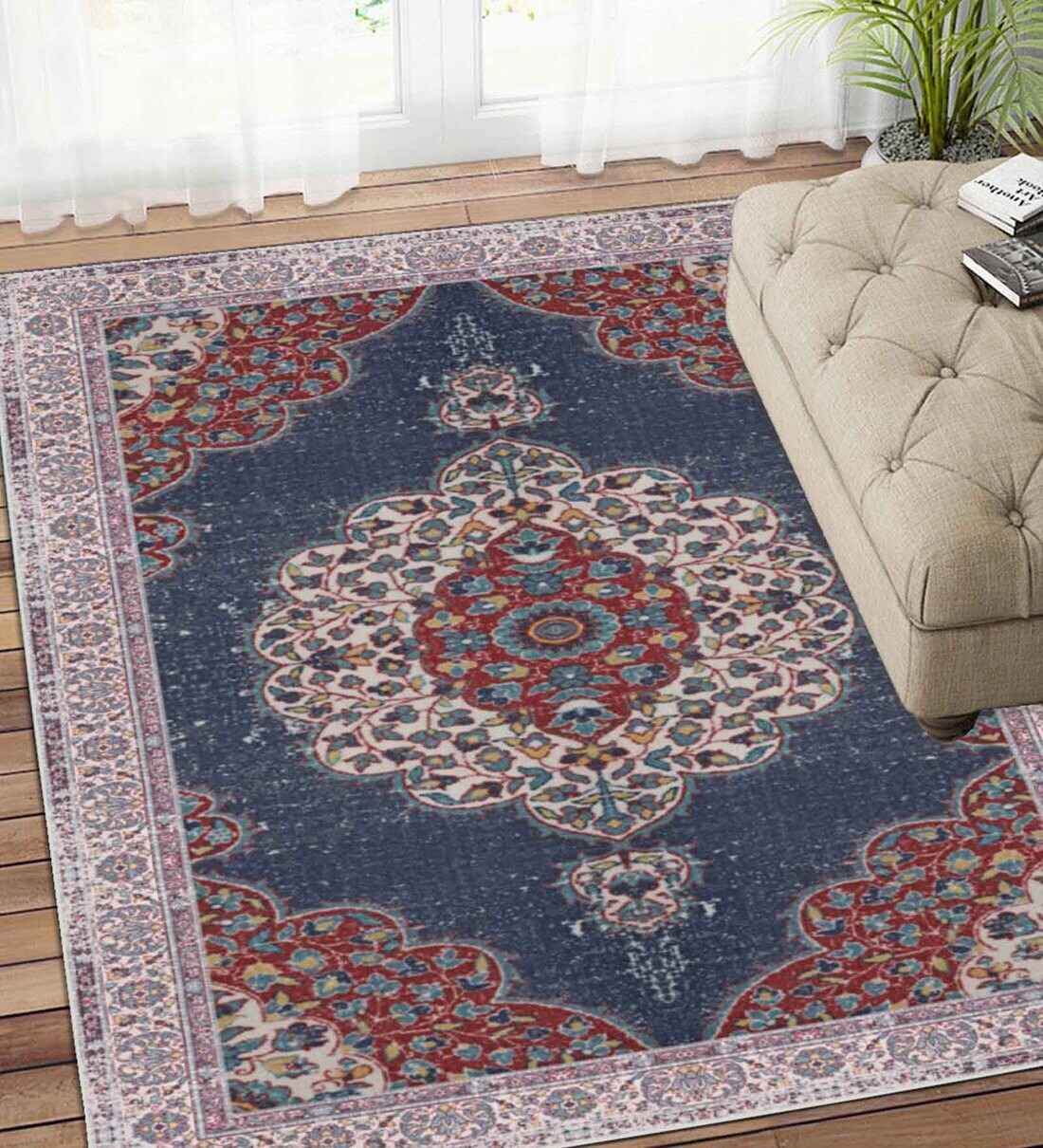 Blue Persian Polyester 5 ft x 7 ft Machine Made Carpet