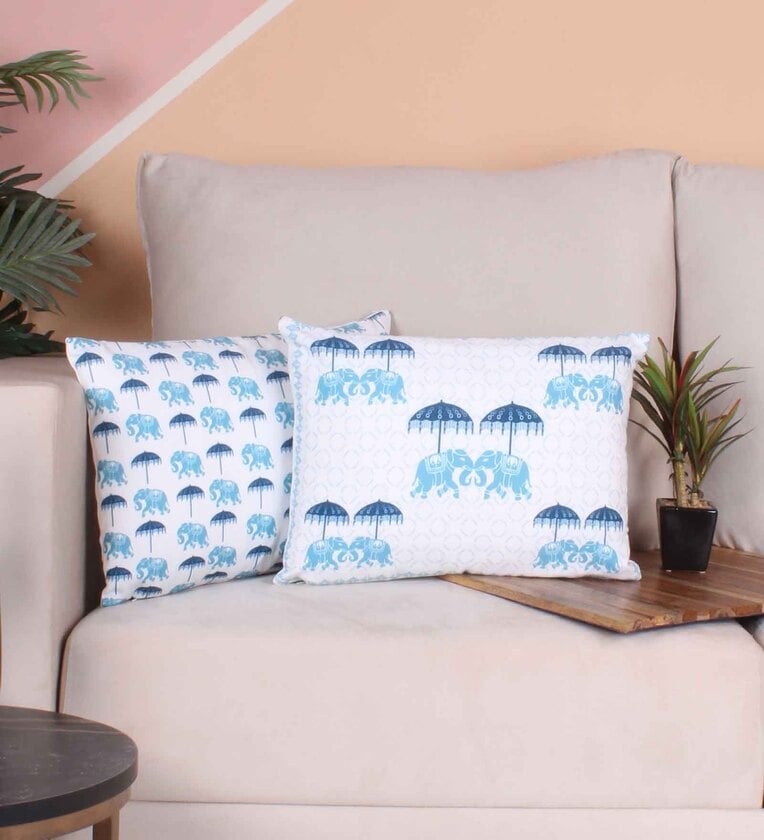 Blue Polycotton Floral 12x18 inches Cushion Covers (Pack of 2)