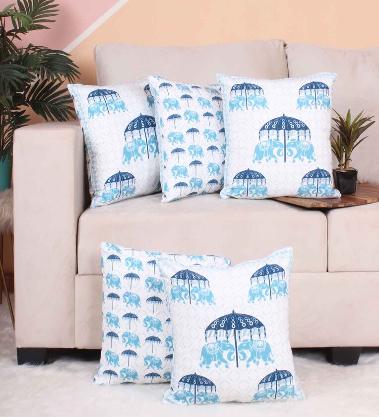 Blue Polycotton Floral 16x16 inches Cushion Covers (Pack of 5)