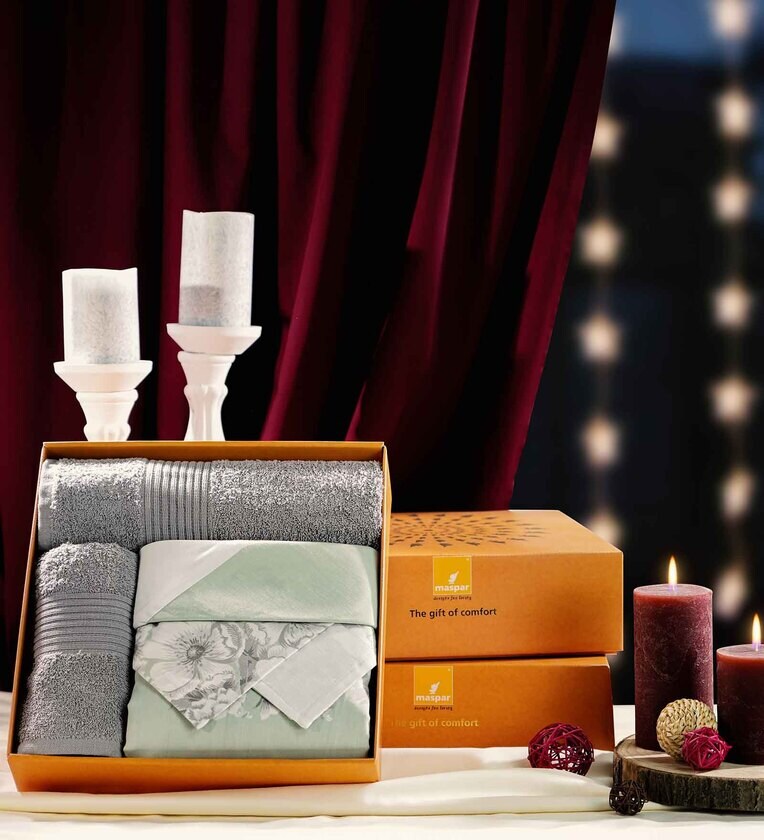 5Pc Bed Bath Set : {1 Bed Sheet (275X275 cm) + 2 Pillow Covers (45X68 cm) +2 Bath Towels (75X150 cm) +1 Box (34.5X34.5X10.5 cm)}