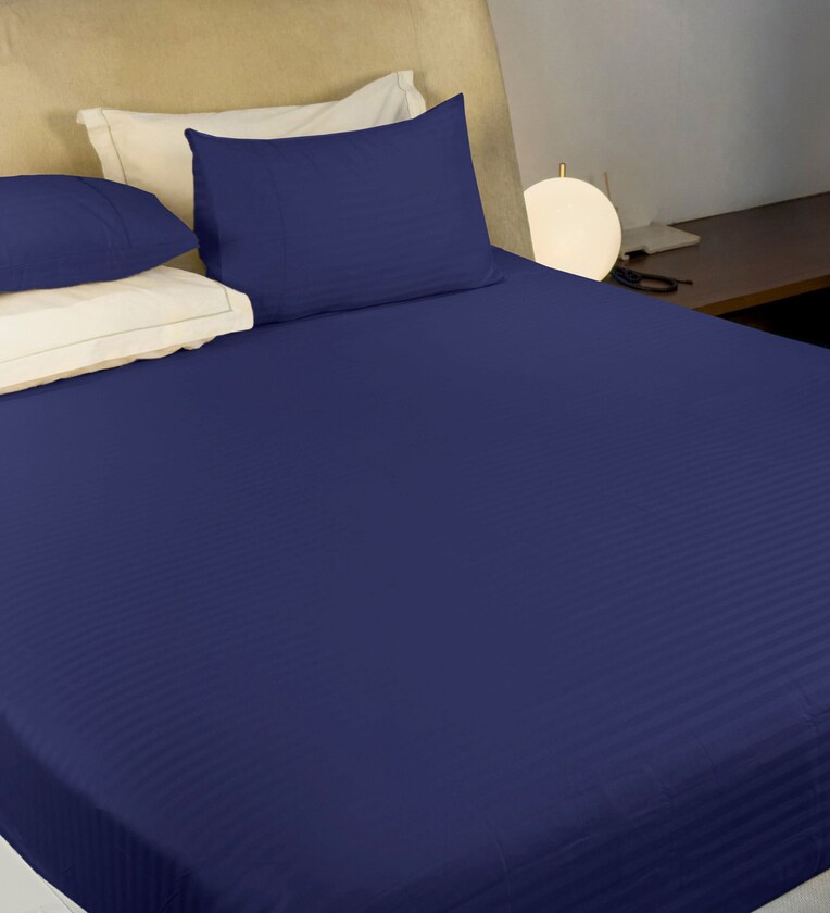 Blue Satin Striped 210 TC Pure Cotton King Sized Bedsheet with 2 Pillow Covers
