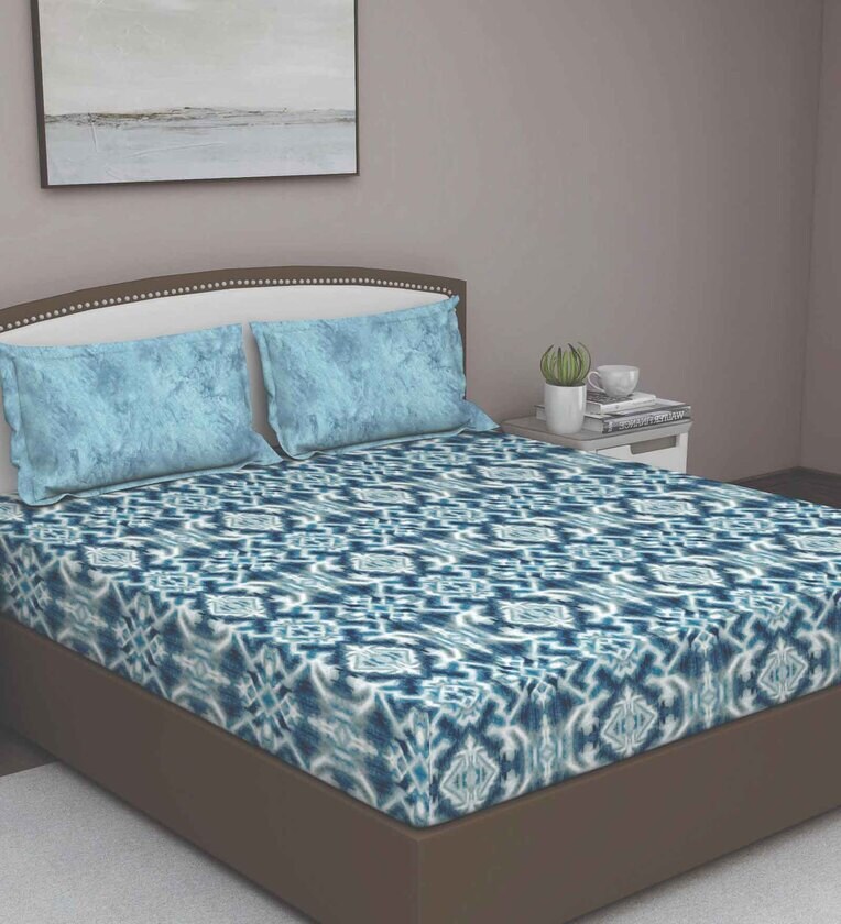 Blue Abstract 210 TC Cotton Queen Sized Bed Sheets with 2 Pillow Covers