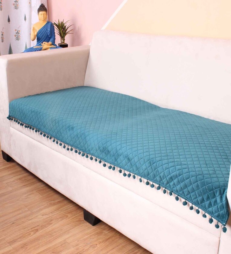 Turquoise Blue Solid Velvet 2 Seater Quilted Sofa Cover (Protector) with Pompom