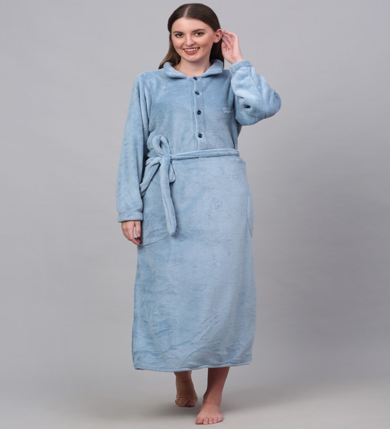 Blue Solid Woolen Women Bath Robe With Belt (S)
