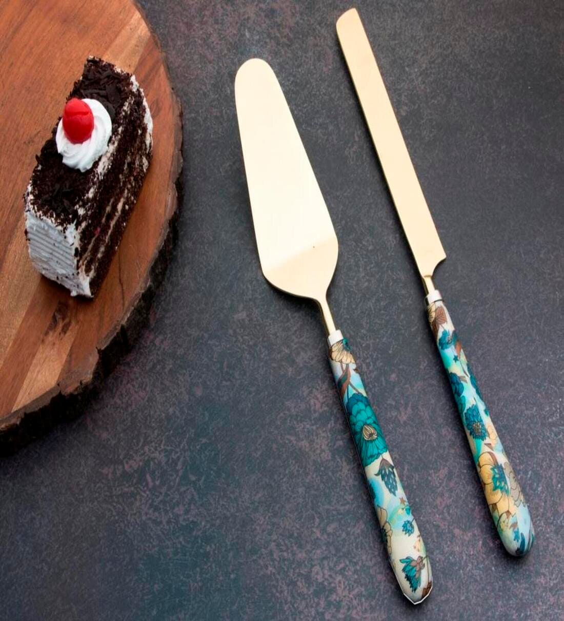 Slice your cake in style with this beautiful set of gold finish cake servers with floral blue handles The gold finished blunt-edged cake spatula is for serving the slice of cake while the sharp-edged knife is for slicing. Serve cakes, Savories and cupcakes with hasslefree experience.Check out our coordinated cake stand, salad bowl and salad servers.