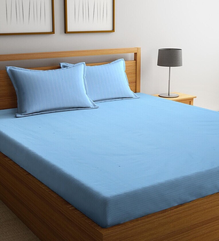 Blue Stripes 300 TC Cotton Blend King Sized Bed Sheets with 2 Pillow Covers