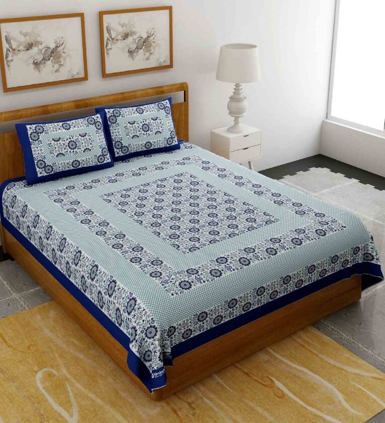 Blue Traditional 120 TC 100% Cotton Queen Bedsheet With 2 Pillow Covers