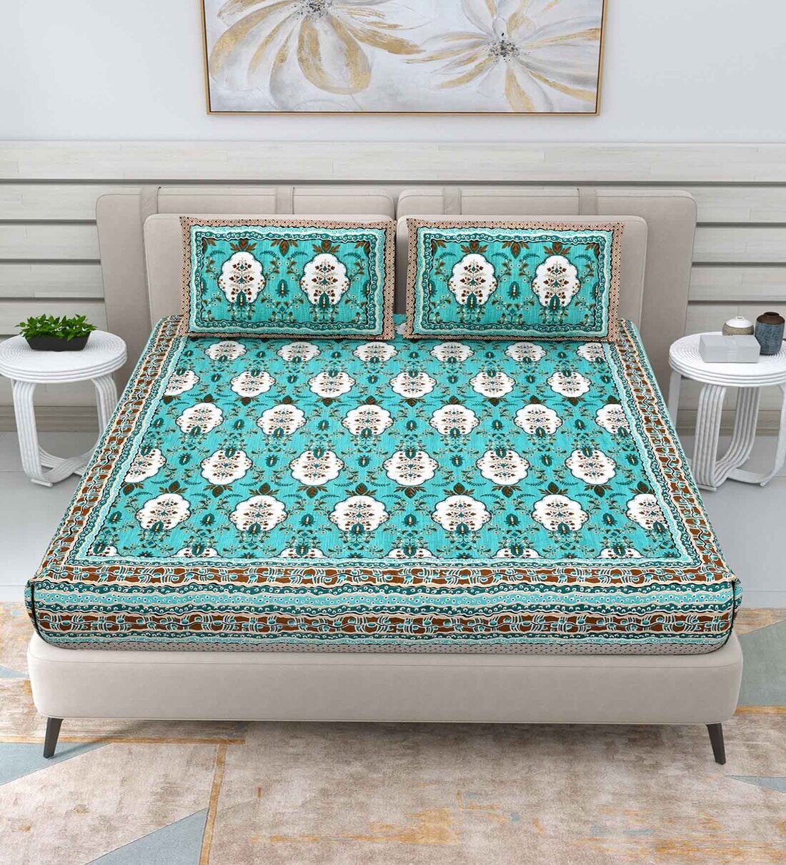 Blue Traditional 144 TC Cotton Double Queen Bedsheet With 2 Pillow Covers
