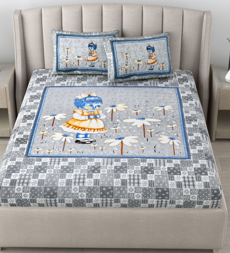 Blue Traditional 180 TC Cotton Printed Bedsheet With Two Pillow Covers For Queen Bed (Doll Printed ,Blue ,153 GSM)