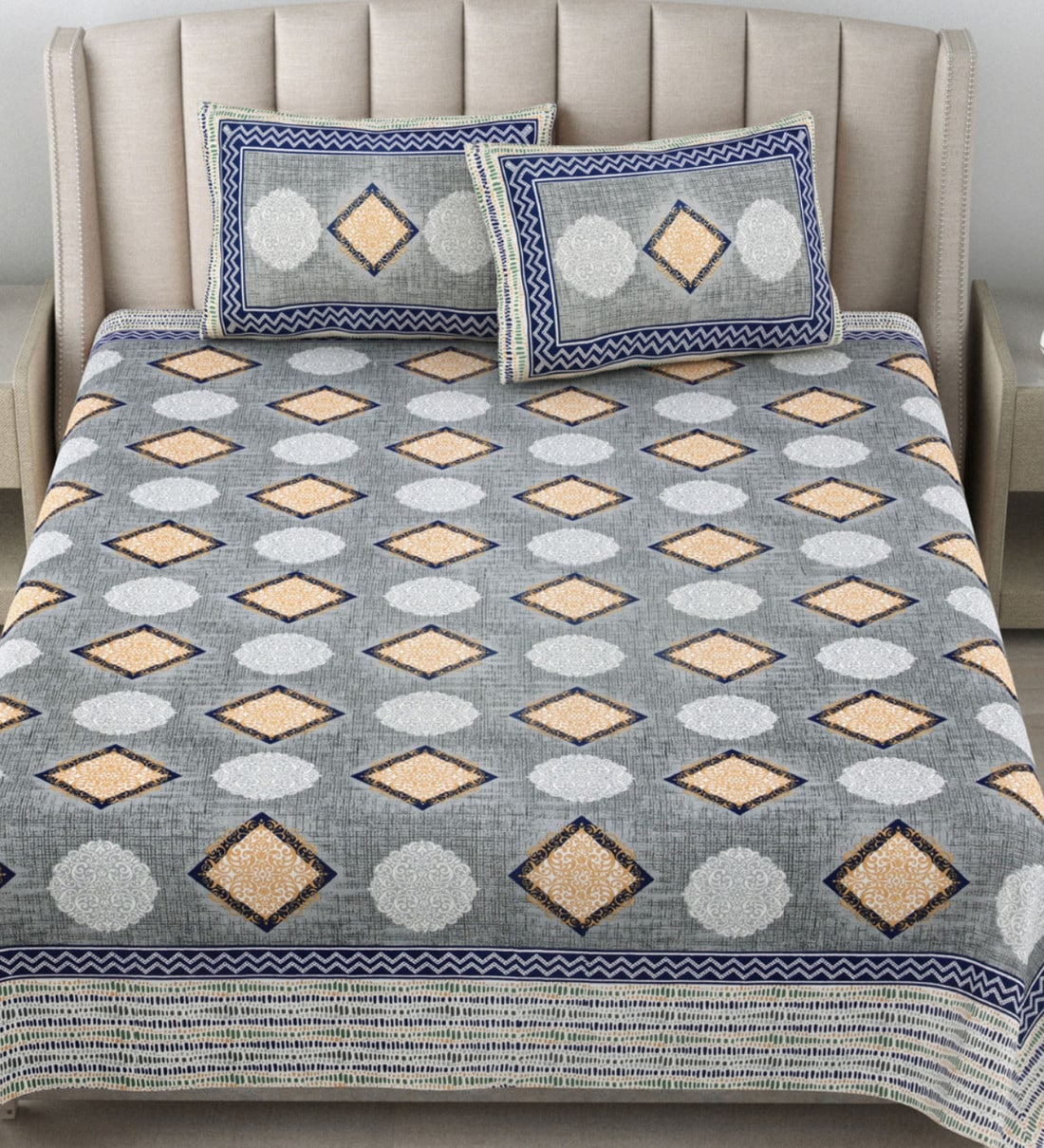Material: 100% Cotton, soft and breathable. Thread Count: 180 TC for a smooth finish. Weight: 153 GSM, perfect for all seasons. Size: Designed to fit a double bed (approx. 90x108 inches) Includes: 1 Bedsheet + 2 Pillow Covers Care: Machine washable for easy maintenance