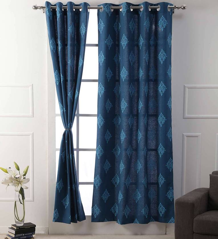 Blue Traditional Cotton 7 Ft Light Filtering Eyelet Door Curtain