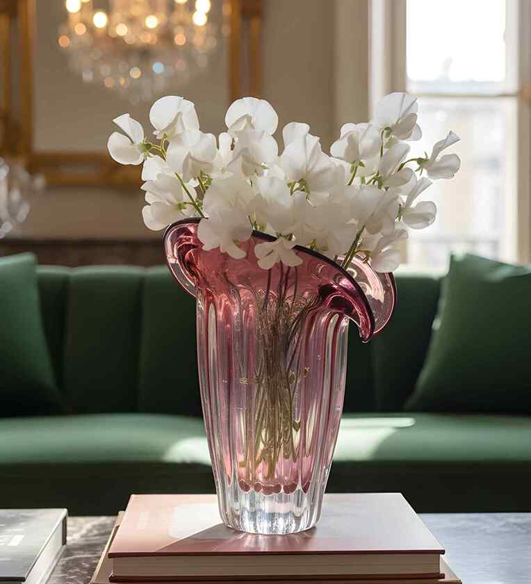 With soft pink glass and a gracefully flared, petal-like rim, this luxury vase evokes a blooming flower. Vertical ribbing adds delicacy, ideal for an elegant modern centerpiece.