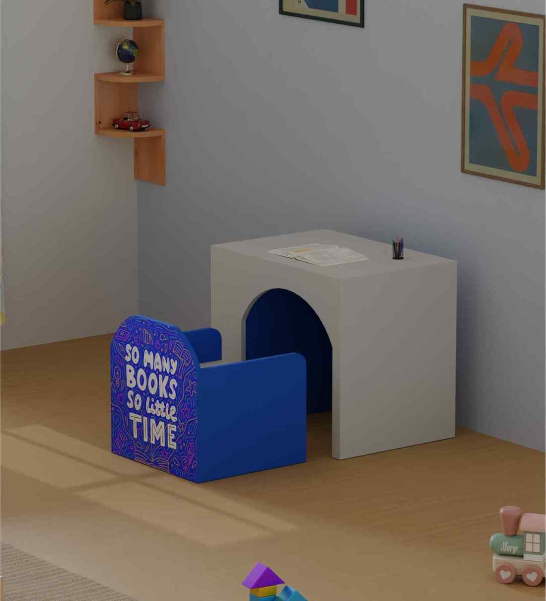 STURDY KIDS STUDY DESK & CHAIR SET Durable study table for kids designed for reading, writing, drawing, homework, online classes, and play. Includes desk + chair combo, and open storage on the side. Ideal study furniture for boys & girls ages 3 8. STORAGE & WORKSPACE Wide table top for all activities, and a Spacious side storage which fits books, puzzles, toys, craft items. The chair neatly slides under the desk, saving floor space and keeping the room open for play SAFE & NON-TOXIC MATERIALS No paint, no harmful chemicals. Scratch-resistant PVC laminated surface in long-lasting colours. Rounded corners for child safety; no sharp edges. PERFECT SIZE FOR GROWING KIDS 20-inch desk height designed for comfort and posture support. Large, ergonomic work surface helps children develop fine motor skills while they draw, write, paint, or study. HEAVY-DUTY & LONG-LASTING Made from high-strength HDF engineered wood with scratch-resistant PVC lamination. No screw joinery joinery ensures sturdy construction and prevents loosening. Chair includes floor-safe plastic buffers to avoid scratches and allow smooth movement. High load-bearing capacity of 70Kgs for growing children. DIY ASSEMBLY + SUPPORT Comes with step-by-step assembly manual and video guide. Need assistance? You can contact Boingg! Service Support on 011-41170803