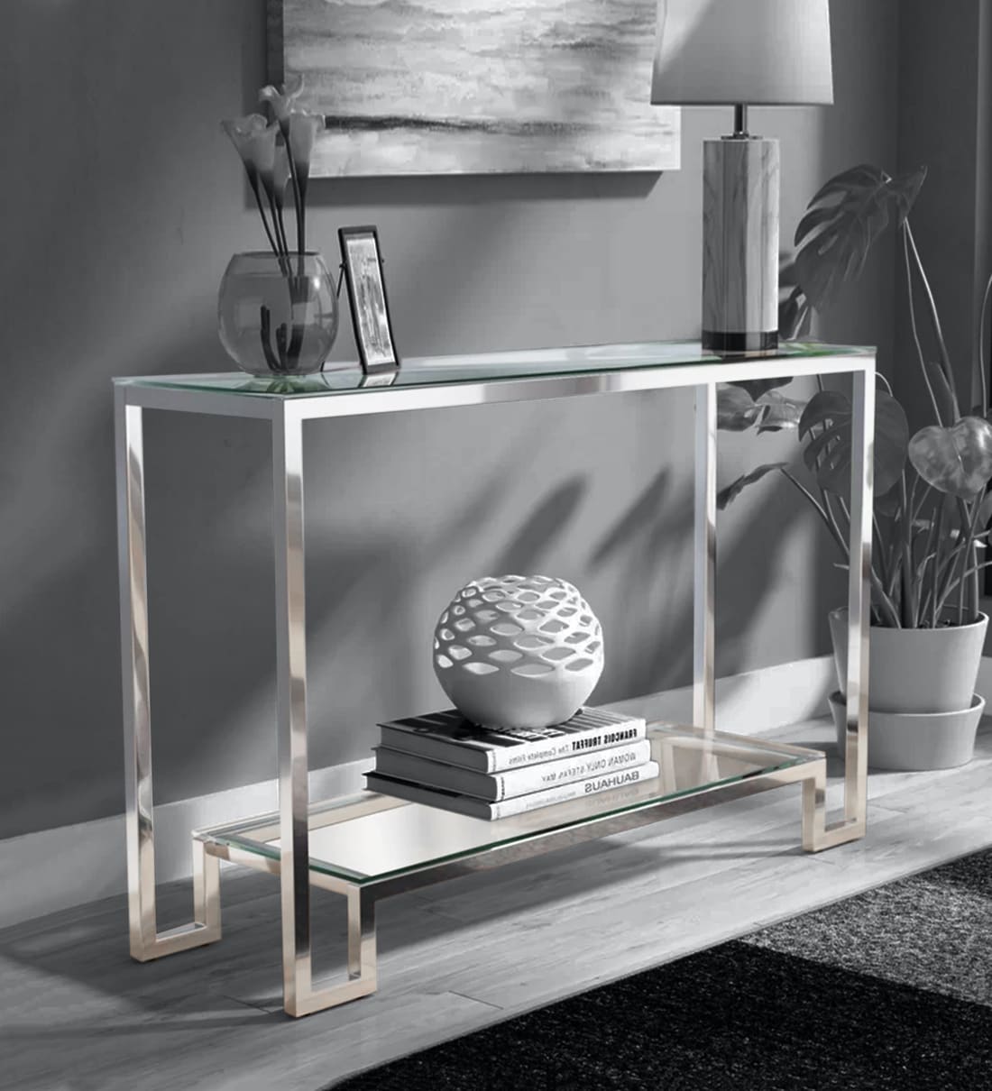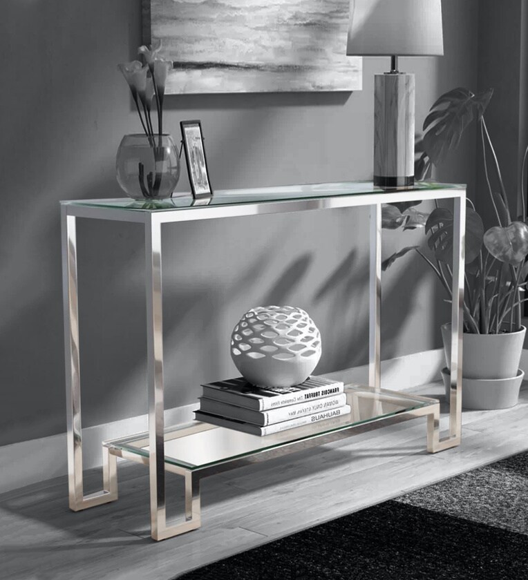 A Console Table is wide, shallow and roughly as tall as a regular table or desk which sits up against a wall. The average console table height is 30 inches, though designs can range anywhere from 28 inches to 32 inches in height.