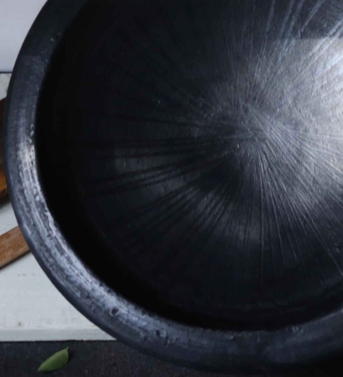 Deep Burned Clay pots are made using a very old traditional pottery technique. A normal red clay pot is kilned once, but deep burned pots are put in the Kiln twice.. The second time, potters bake the pots stacked together with wood and sawdust at a high temperature. This blackens the pots and also makes it very strong and durable. Deep Burned Tavas can withstand very high temperature and last longer.