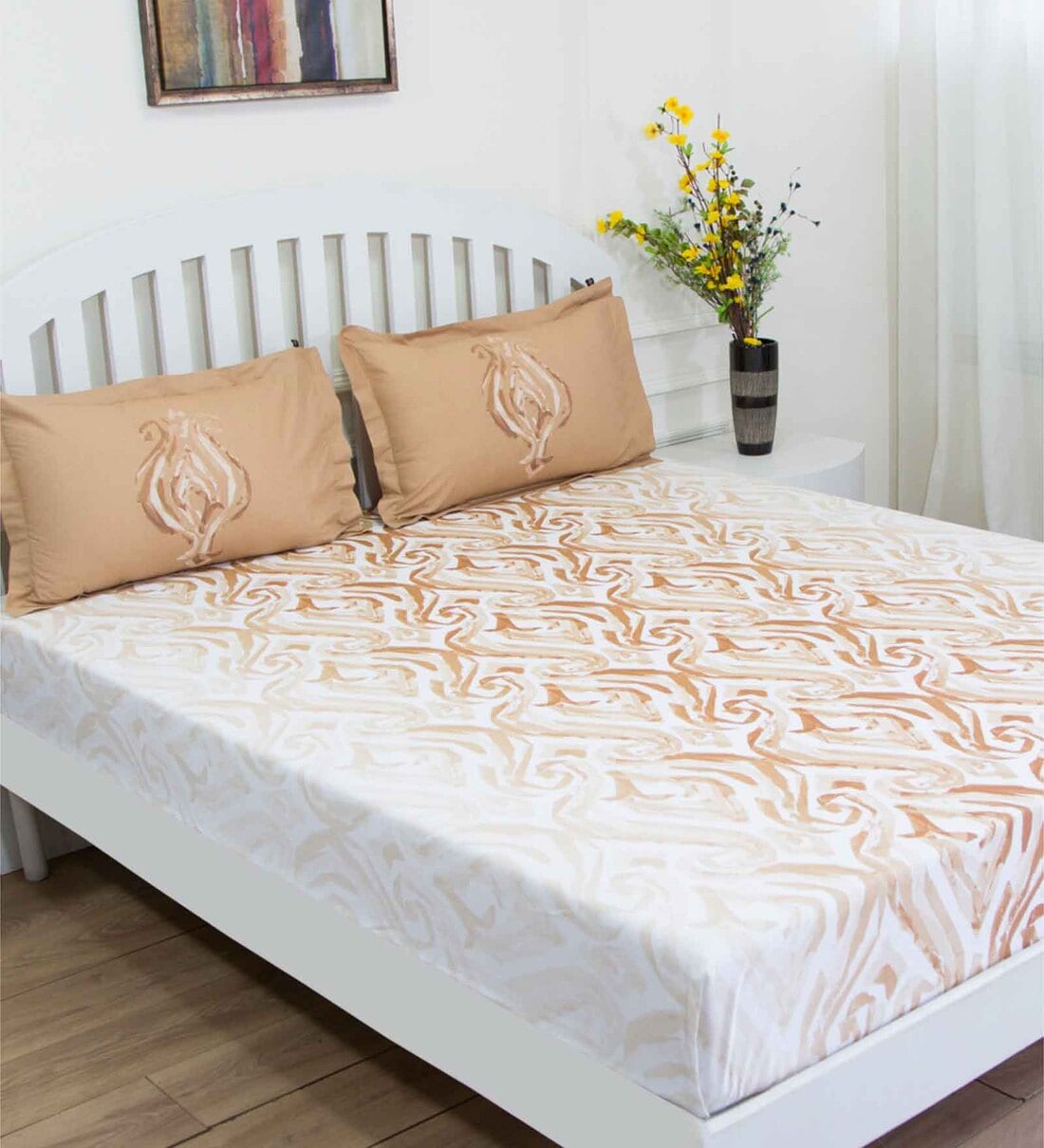 Brown Abstract 144 TC Cotton Queen Sized Bed Sheets with 2 Pillow Covers