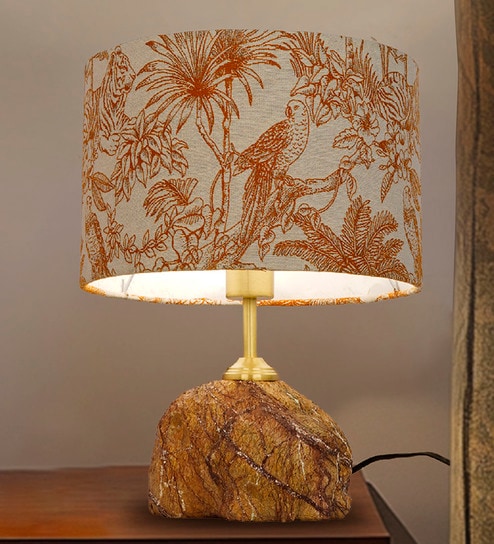 Bring a touch of nature-inspired artistry to your home with this Brown Bidasar Marble Table Lamp. This 17-inch tall lamp features a unique, abstract base crafted from raw, textured Bidasar brown marble, showcasing its natural veining and rich tones. A sleek brass stem adds a touch of modern elegance, leading to a self (woven) fabric drum-shaped shade featuring a captivating jungle theme. This lamp offers a perfect blend of organic materials and artistic design, making it a statement piece for resorts, hotels, living rooms, bedrooms, or studies.