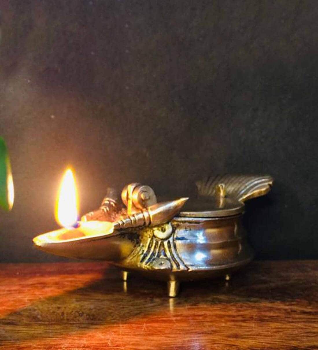 The handcrafted oil lamp is the replica of fictional Chirag of Aladdin. This diya is made of brass. The oil lamps are used in India to worship God and to remove darkness. The height of the product is 1.8 inch and the width is 5.4 inch.
