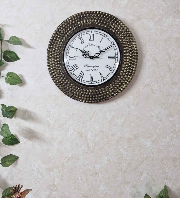 Handmade & Handpainted Brown colour Engineered wall clock in Distress finish. It has beads all around the clock. It has Roman Numbers. It gives a vintage look & feel to the wall