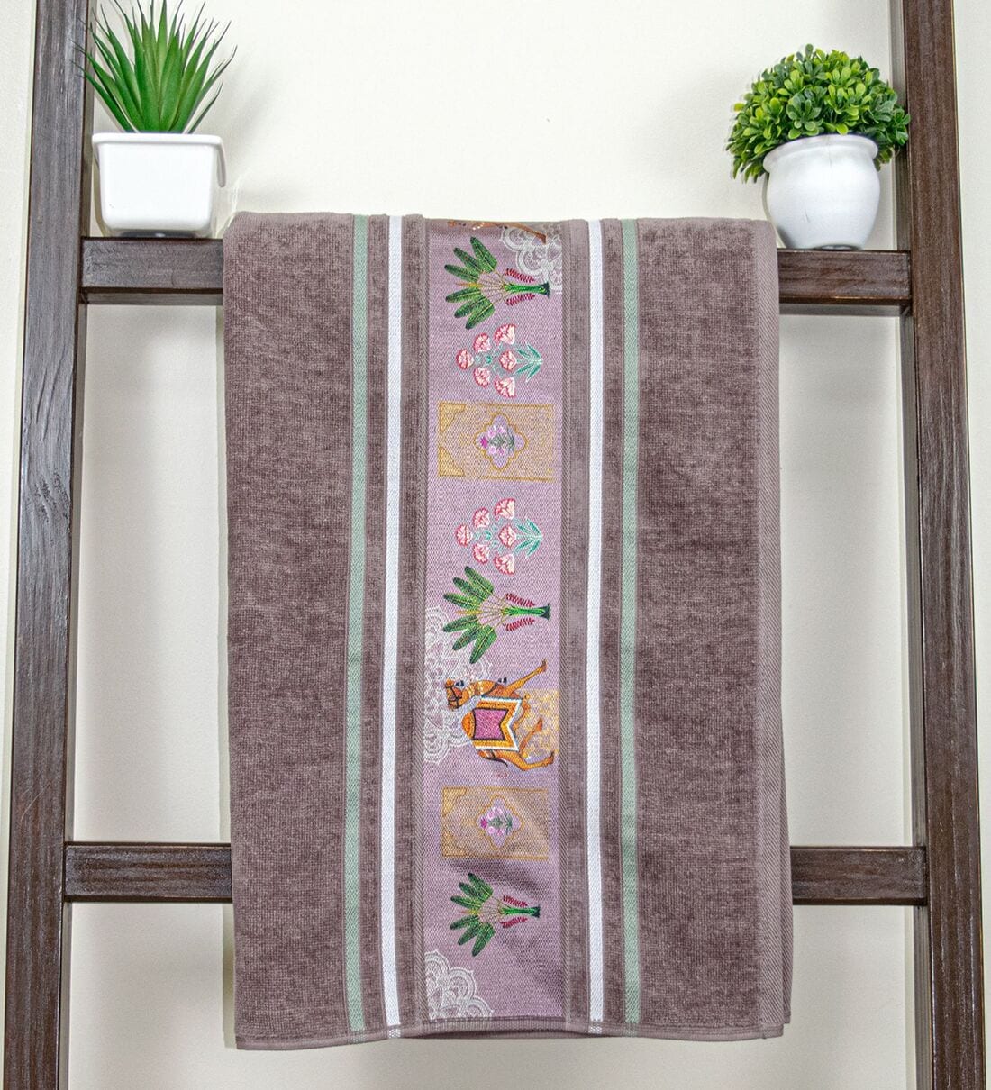 Experience pure luxury with the Rangoli 100% Cotton Regal Bath Towel. This ultra-soft and highly absorbent towel, adorned with an elegant Camel and Grass print on a light beige background, brings a touch of sophistication to your bathroom. With a high GSM rating of 460, it ensures rapid moisture absorption and quick drying, making it the perfect choice for both men and women. Elevate your daily bath routine with this premium quality, quick-dry towel that combines comfort, style, and functionality.