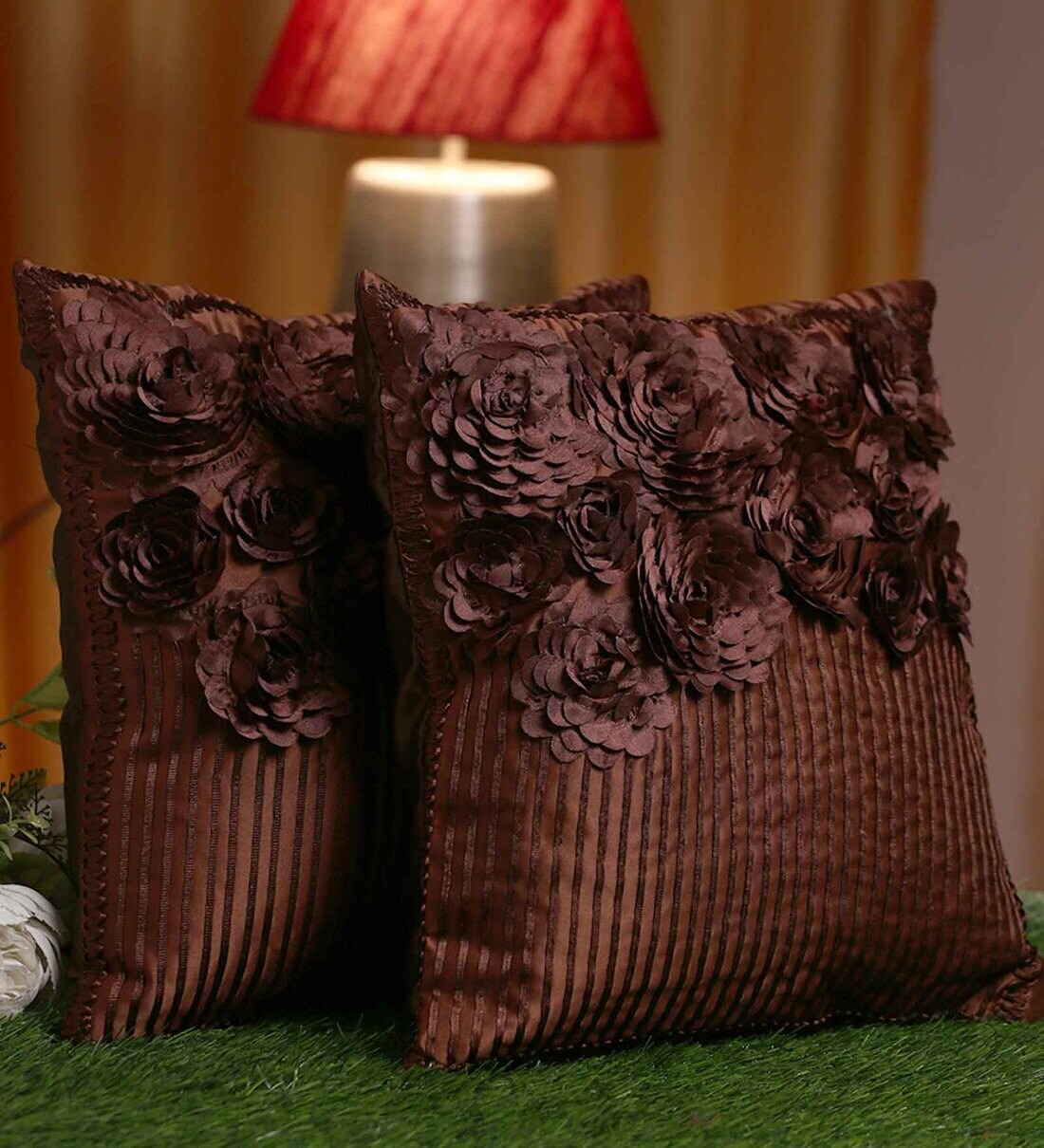 Brown Embroidered Polyester 16X16 Inches Cushion Cover (Set of 2)