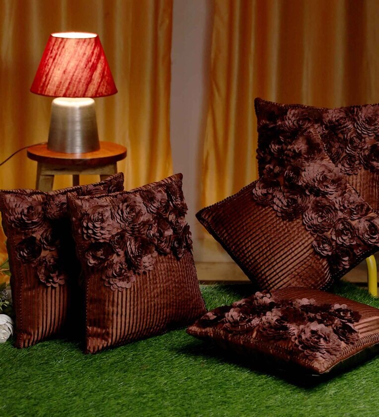 Brown Embroidered Polyester 16X16 Inches Cushion Cover (Set of 5)
