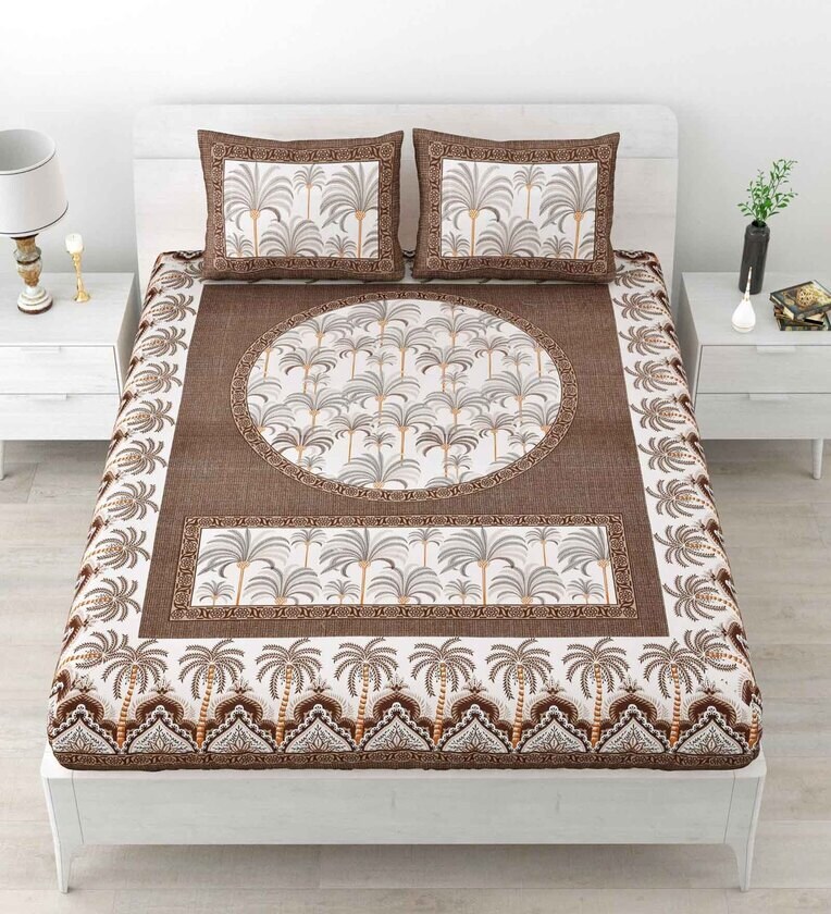Brown Floral 120 TC Cotton Queen Sized Bedsheet with 2 Pillow Cover
