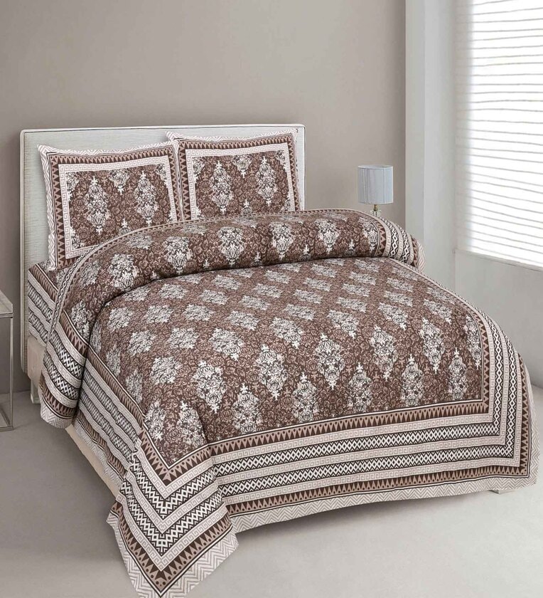 Brown Floral 144 TC Cotton King Bedsheet and 2 Pillow Cover