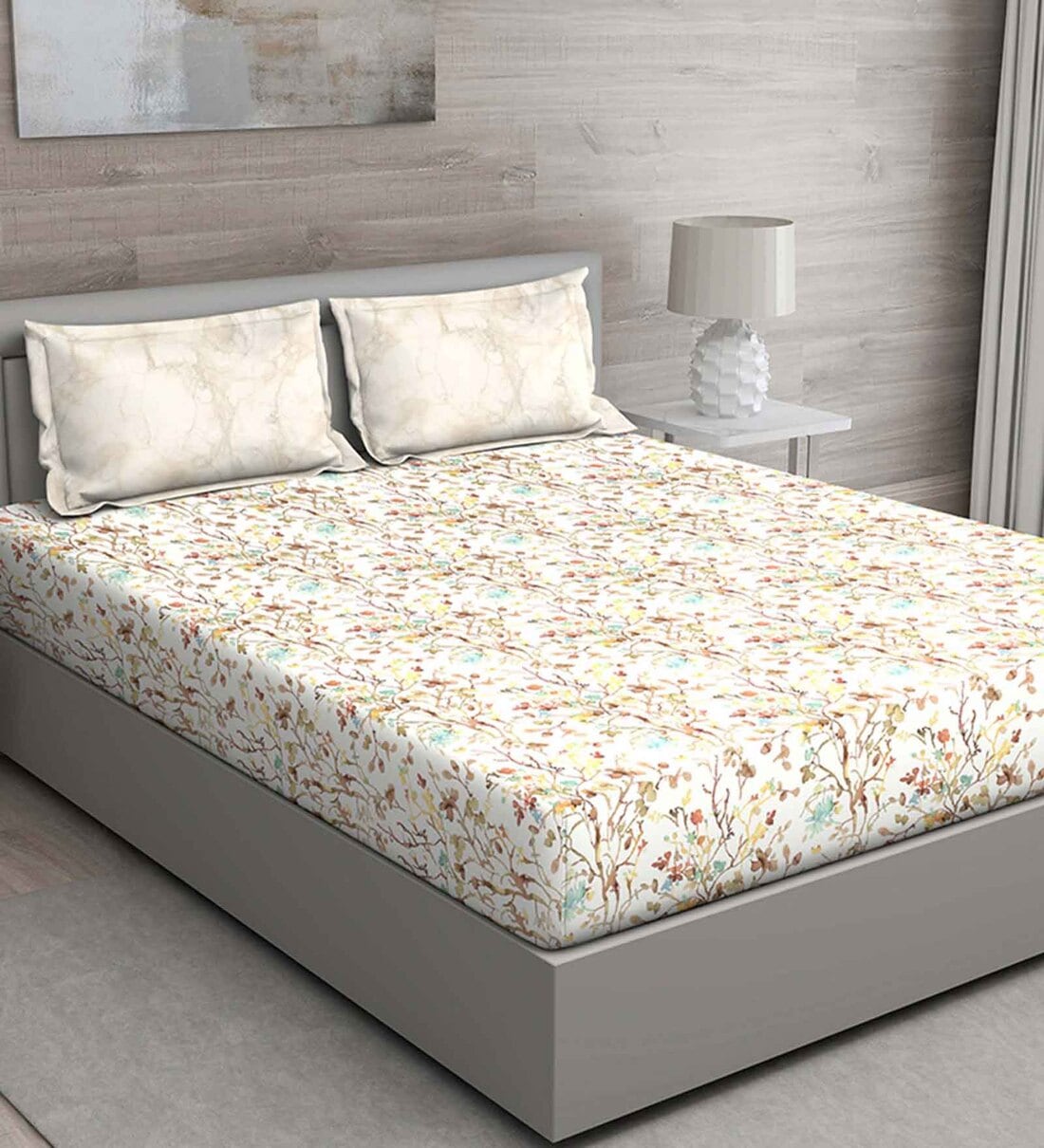 Brown Floral 144 TC Cotton King Sized Bed Sheets with 2 Pillow Covers