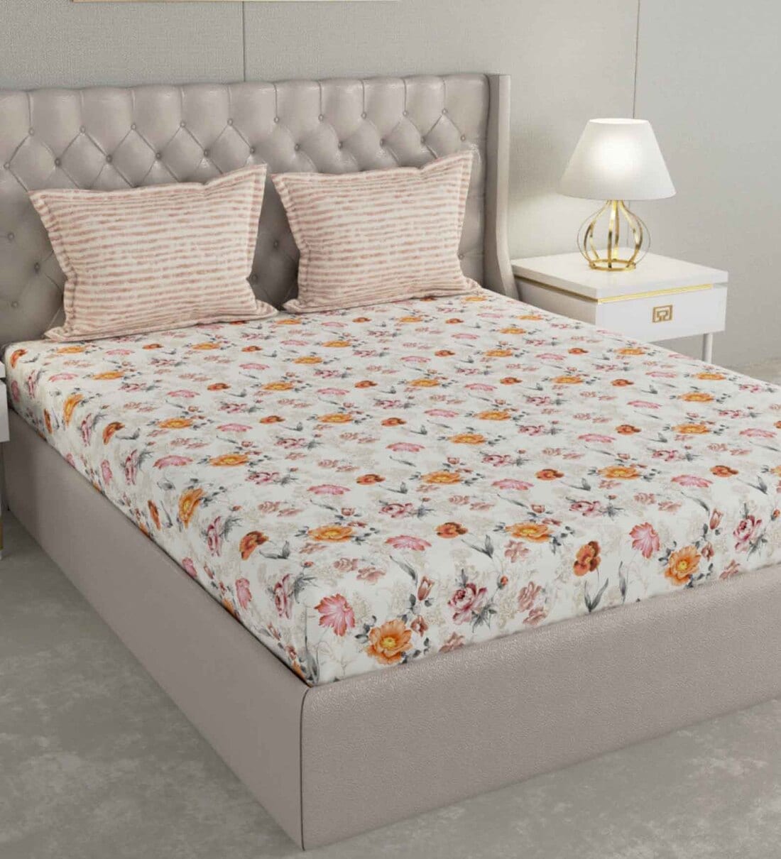 Brown Floral 144 TC Cotton Queen Sized Bed Sheets with 2 Pillow Covers