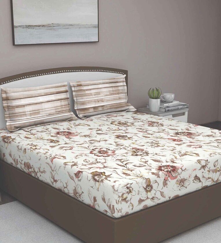 Brown Floral 180 TC Cotton Queen Sized Bed Sheets with 2 Pillow Covers