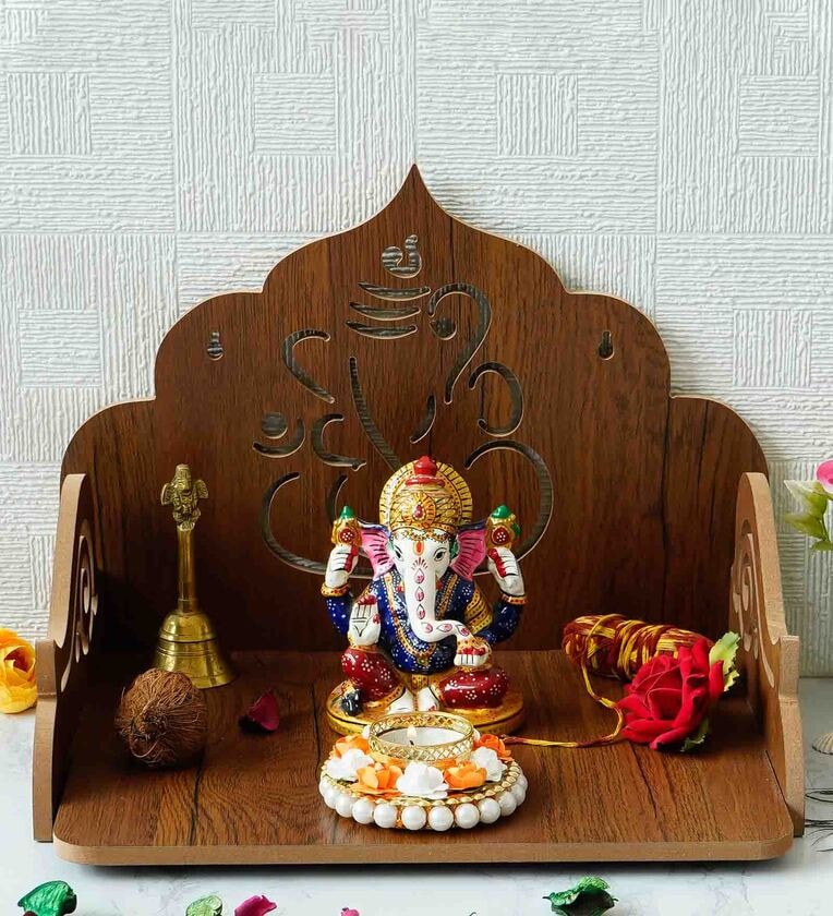 Brown Ganesha Design Laminated Wood Pooja Shelf