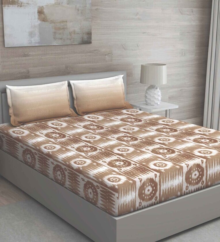 Brown Geometric 150 TC Cotton Queen Sized Bed Sheets with 2 Pillow Covers