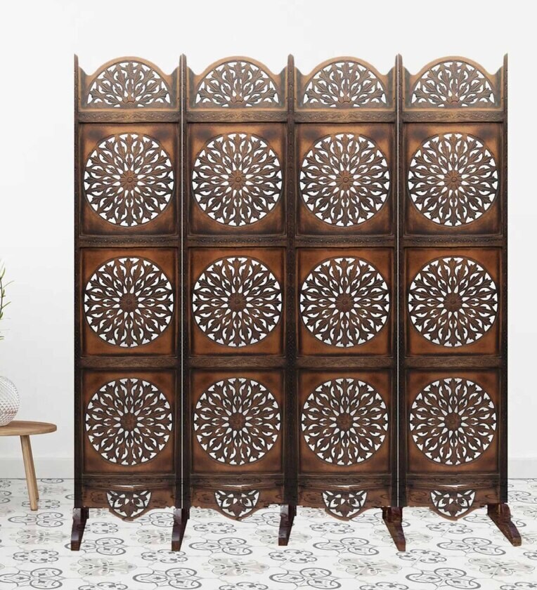 Brown Handcarved Wooden Room Divider Four Panels In Circular Floral Pattern With Stand