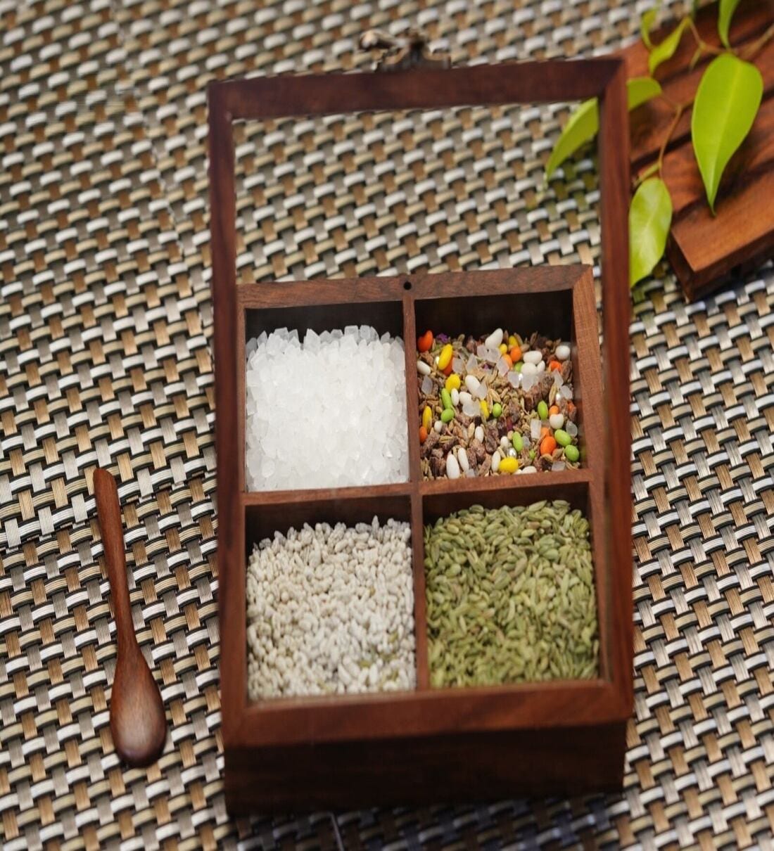Brown Sheesham Wood 4 Containers (Each 40ml) Spice Box With Spoon