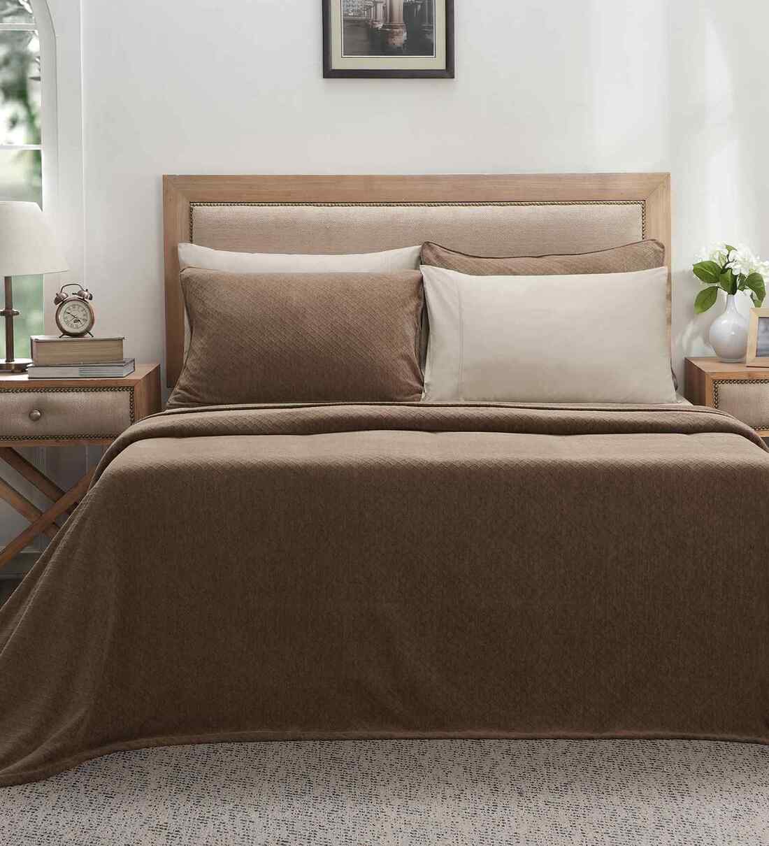 100% Cotton Bed Cover. Soft textued diamond pattern all over to enhance the aesthetics. Easy care finish to ensure low wrinkle effect. Processed to provide lustre and smooth finish to the fabric. Multi utility product can be used as blanket, bed throw. Bed cover has high color fastness making it look as good as new for a longer period of time. Can be used as blanket.