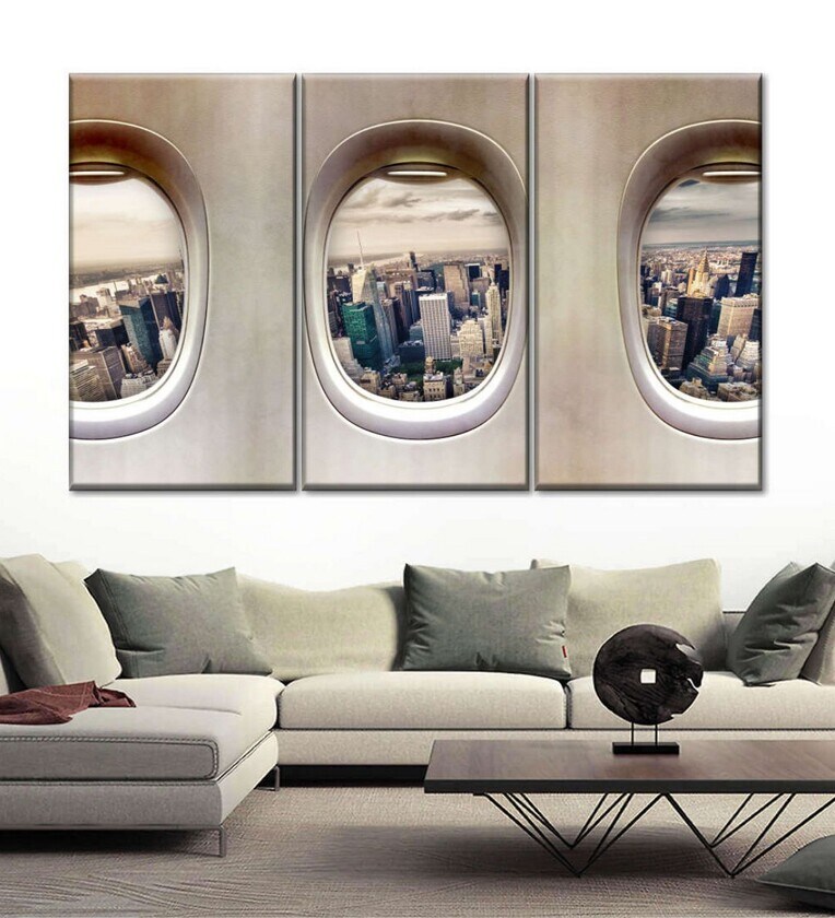 Brown White Airplane Windows Printed Framed Wall Art Panels ( Set Of 3)