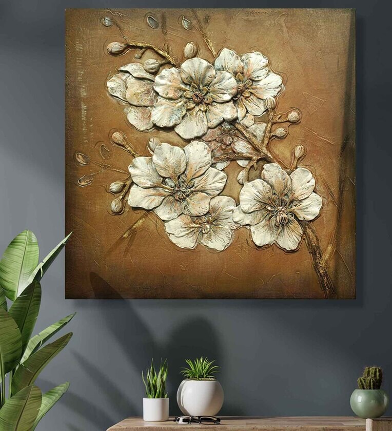 Brown White Floral Wall Painting Embossed Original Painting On Canvas