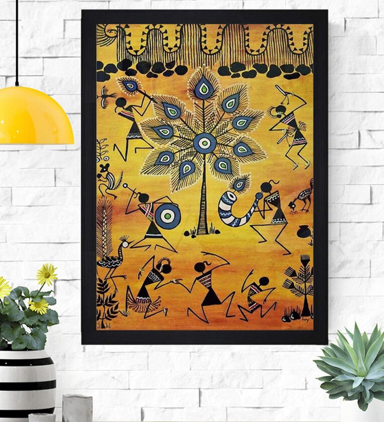 Brown Wood "Ethnic Tribal Dhokra and Warli Art" Textured Paper Scratch & Dust Proof Framed Art Print