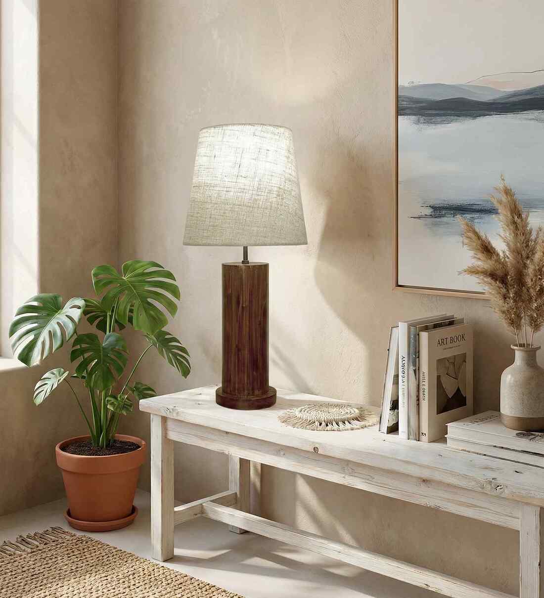 Cedar Wooden Table Lamp with Jute Shade & Brown Base