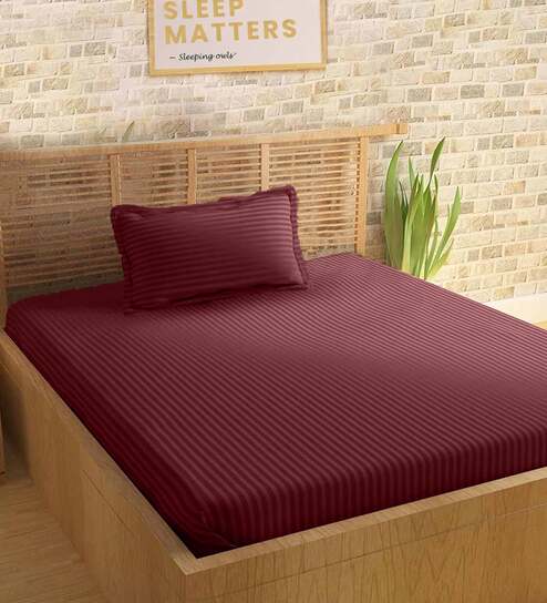 Burgundy Striped 210 TC 100% Cotton Single Bed Sized Bed Sheets With 1 Pillow Cover