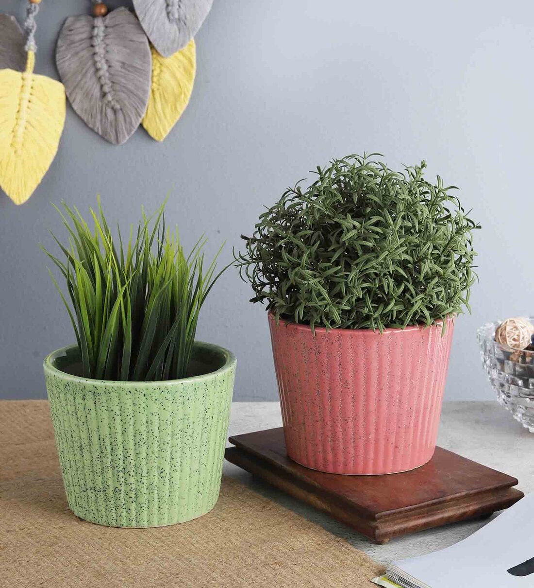 Camouflage Green And Rose Pink Ceramic Textured Planter, Set of 2