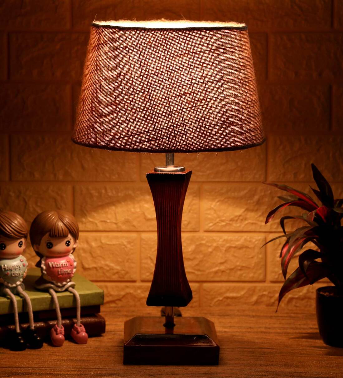 Canvas Brown Natural Fiber Shade Night Lamp With Wood Base