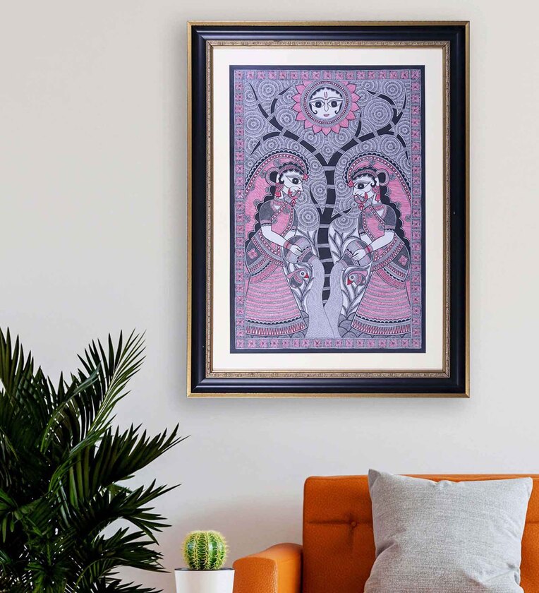 Very intricate hand-made beautiful Gond art paintings by Indian masters(inspired by nature and its elements). Encased in the champagne-colored frame.Ready to adorn your abode.