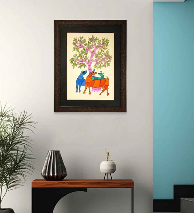 Very intricate hand-made beautiful Gond art paintings by Indian masters(inspired by nature and its elements). Encased in the champagne-colored frame.Ready to adorn your abode.