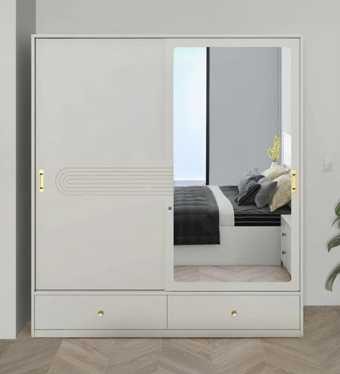 Inside, you'll find smart storage options including two external drawers and a full-length external mirror that adds depth and style to your room. Accented with gold-colored hardware, this piece brings both beauty and organization into your living environment.
