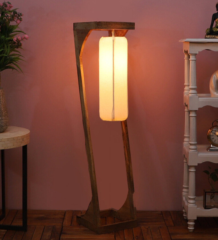 Castilla White Cotton Shade Club Floor Lamp With Mango wood Base