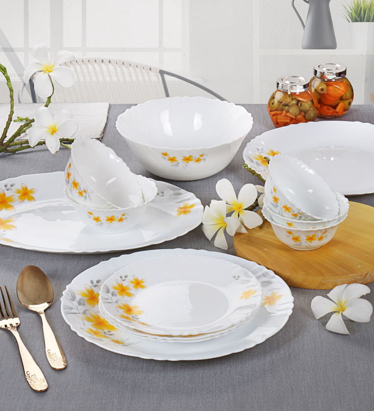 Dinner Plate "11"(270 Mm X 6 Pcs), Quarter Plate(190 Mm X 6 Pcs),Serving Bowl (1370 Ml) (205 Mm X 2 Pcs),Veg Bowl (290 Ml) (112 Mm X6 Pcs),Soup Bowl (190 Ml) (125 Mm X 6 Pcs),Oval Platter(330 Mm X 250 Mm)(1 Pcs).