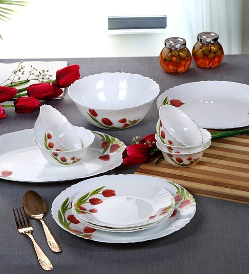 Cello Imperial Red Bloom Opalware Dinner Set, 33 Pc