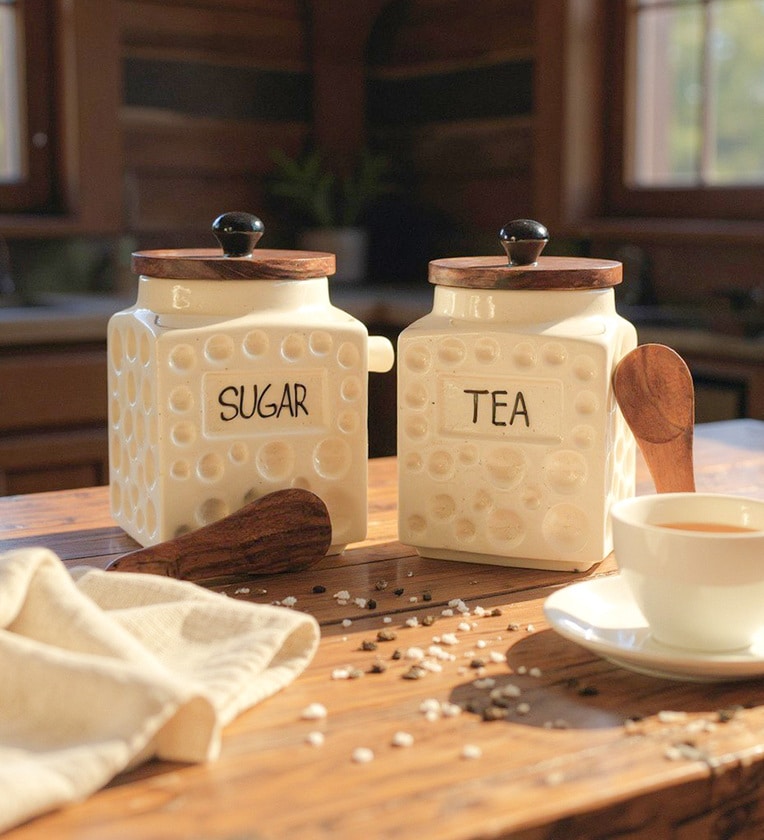 The VOIDROP Ceramic Sugar Tea Jar Container Set includes two beautifully handcrafted ceramic canisters, perfect for stylish and functional kitchen storage. Each jar has a 250ml capacity and comes with a secure wooden lid and a matching spoon, ensuring your tea, sugar, or spices stay fresh and easily accessible. Designed with both elegance and practicality in mind, these airtight containers are ideal for use on countertops, in pantries, or as part of your home d cor. Their sleek, minimalist look adds a touch of sophistication to any kitchen, while the durable ceramic build ensures long-lasting use.